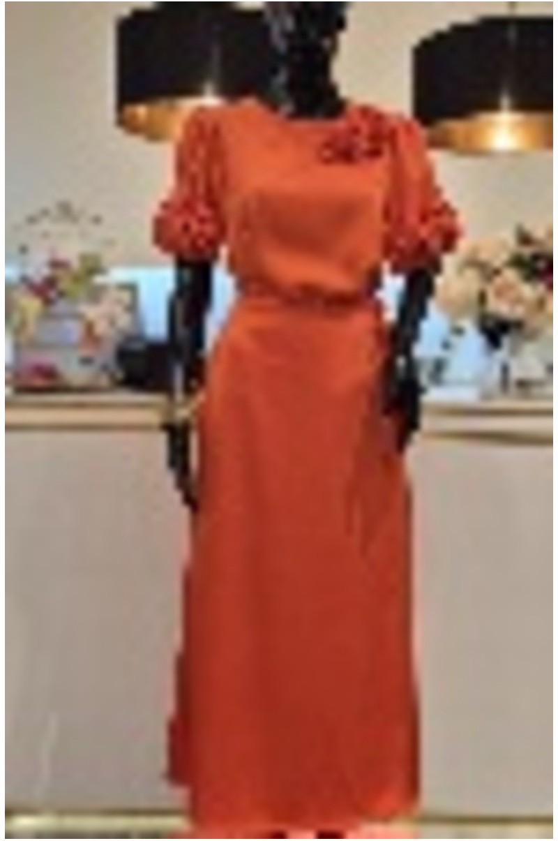 Conjunto falda y blusa. Satinado. Falda larga evasé. Blusa manga corta abullonada. Detalles rosa en manga y escote.