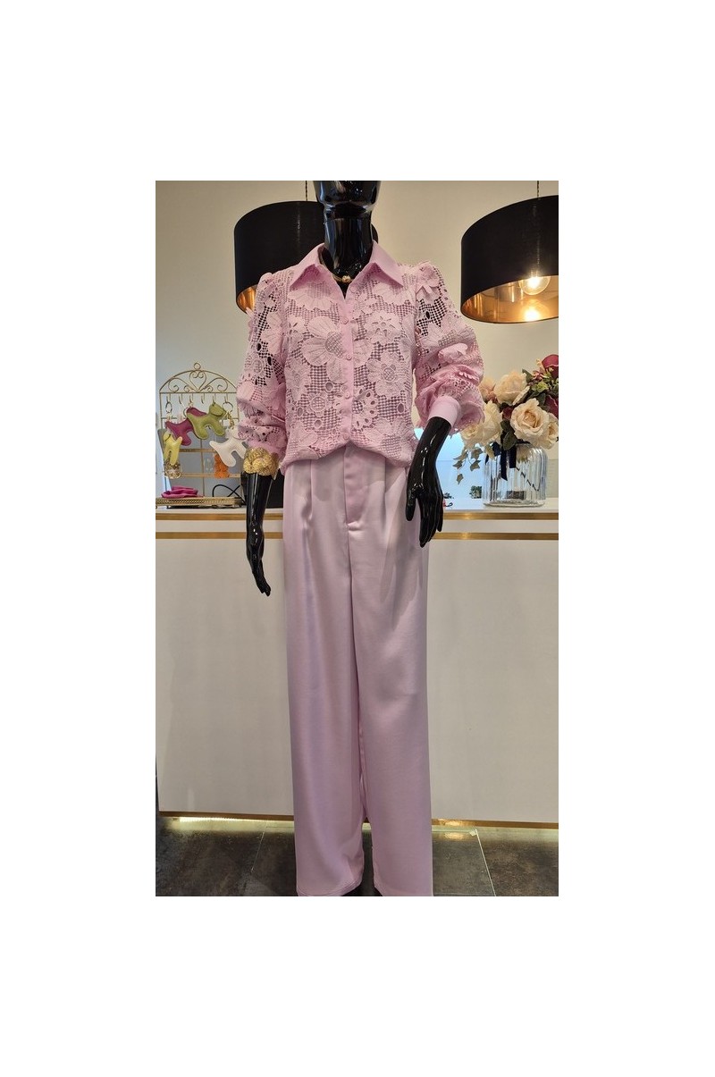 Conjunto pantalón palazzo satinado con bolsillo y camisa manga larga perforada con forro, detalle flor relieve.